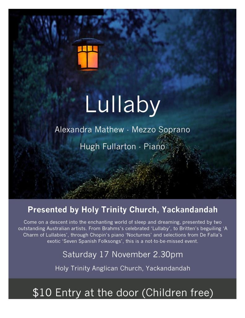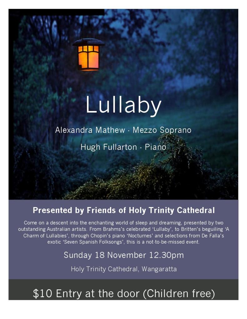 Last weekend Hugh Fullarton and I had a wonderful time performing our Lullaby program for the people of Yackandandah and Wangaratta. For those who missed out, here’s a short video from our recital at Wangaratta Cathedral.